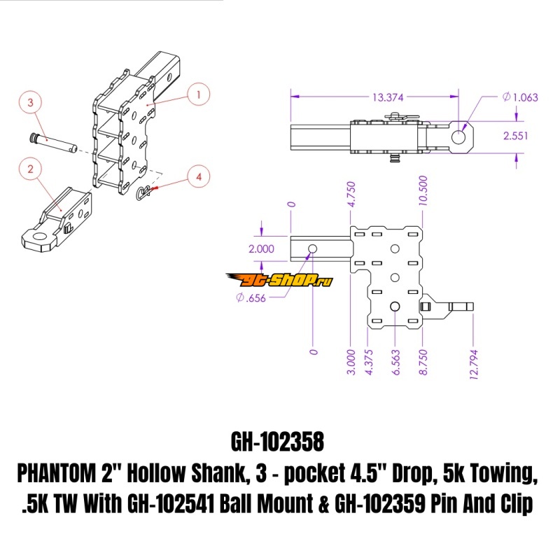 Gen-Y Phantom 2in Hollow Shank 4.5in Drop 500lb TW 12K Hitch w/GH-102541 Mount/GH-102359 Pin & Clip